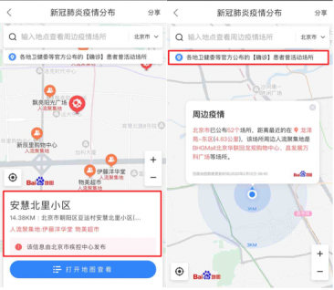 在多地区迎来返岗、返工日后,社区防控更是成为防止疫情扩散、蔓延的重要环节之一,而此次升级则希望为社区防疫提供更直接、多维的信息参考。据了解,升级后的百度地图“疫情小区”专题地图,待用户进入后,可基于用户定位智能弹出“周边疫情卡”,显示出当前所在城市的疫情场所个数、距离1公里内的疫情点个数、距离3公里内的疫情点个数,以及最近的疫情点名称和该疫情点人流聚集地等多维实时信息简报,方便用户快速了解周边疫情情况,及时做好防疫工作。