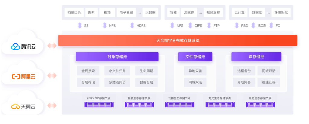针对非结构化数据,天合翔宇提供X3DS立体数据管理系统,支持非结构化数据的复制、迁移、备份、归档功能;支持跨厂商的文件和对象存储之间数据相互移动,支持跨云的数据上云和下云。