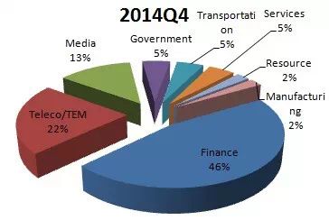 销售的行业分布和高端有点相似,金融占据一小半市场,其次是运营商。但我们看到,第三不是政府,而是传媒行业。