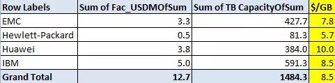 西瓜哥拿2014年全年的数据来分析一下,发现每GB的价格都超过了5美金,华为甚至卖到了10美金(可能是单台配置容量比较少)。平均的售价还在8.5美金/GB,还是比较贵的。这个也是影响在中国市场拓展的一个原因吧。