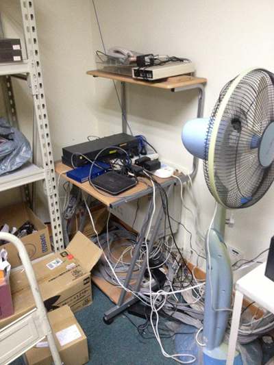 而就曹经理近年来帮各种规模企业环境规划、架设基础设施架构的经验来看,越来越多的中、小企业或大企业分支机构,会将这些接入层的网络计算设备,架设在开放式的工作环境中。比如很多小公司就会直接将交换机、路由器堆放在办公室的打印机桌下面。即便是有些企业稍微重视一点,准备了一个独立空间存放这些设备,甚至购置了专用机柜,但往往也都是开放式的环境,空间里同时还充斥着其他很多东西,比如兼作堆货的库房,或者保安监控室等。