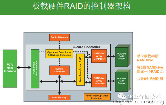 上图中的G-card Controller就是刚才所说的“枢纽芯片”,其内部除了PCIe 2.0 x4接口之外,System Controller管理者控制缓存和数据缓存,此外还有8个NANDrive ArrayController模块,各自控制5颗NANDrive组成多个RAID组。