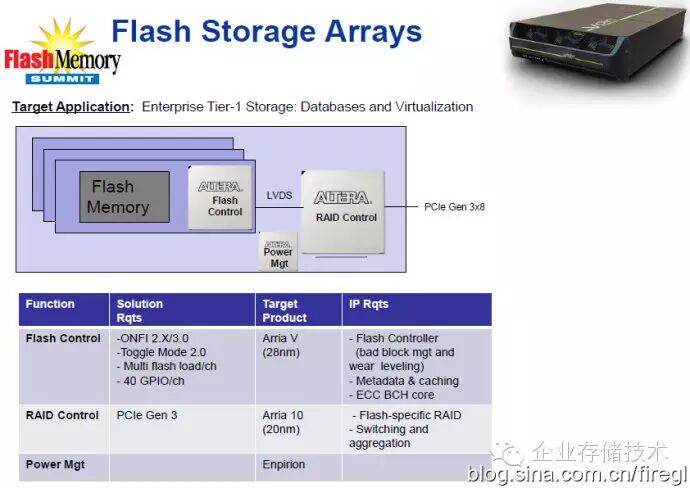在Violin Memory全闪存阵列中,FPGA的应用就分成了2部分——RAID控制和闪存控制,IBM FlashSystem(TMS)的情况也是类似。这里的Flash Control和闪存尚未封装在一起,整个存储系统的规模也比单卡要大。