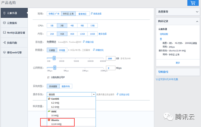 在腾讯云上面购买一台机器,用于私有仓库的搭建。目前腾讯云官方提供的镜像中,CentOS和Ubuntu12.04已经支持Docker的执行环境。这里以Ubuntu为例,购买一台2核4G,100G的云盘,2M带宽,Ubuntu12.04 64位的机器: