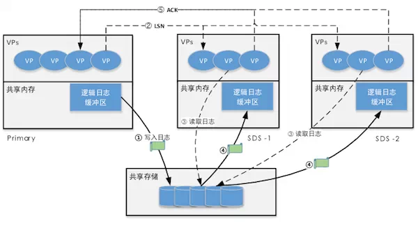 看了这个图,相信你对主节点逻辑日志缓冲区写入数据到共享存储,从共享存储分享数据到SDS辅节点逻辑日志缓冲区,主节点和SDS之间的切换会有一个很好的概念了。