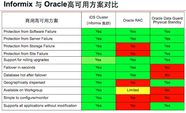 Informix的SDS与Oracle RAC对比来看,有其相同点,都是基于共享存储高可用集群;都具有扩展性,可以在一定范围内随业务需要而扩展;节点间关系对等,有节点失败后,集群中其它节点会接管失败节点的工作。