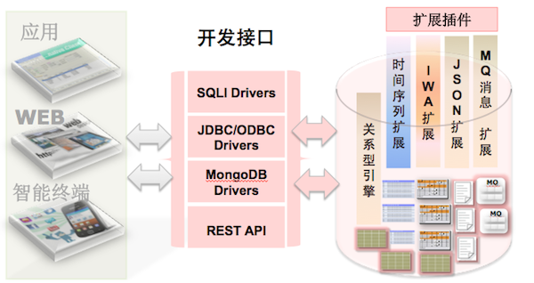 Informix支持开发接口非常多,扩展插件以数据库扩展方式提供对多种数据格式的存储支持,包括时间序列数据、OLAP列存、JSON文档、MQ消息。