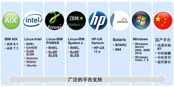 Informix支持主流OS包括Linux、UNIX、Windows,以及国产OS中标麒麟、中标普华、浪潮、K-UX、凝思,支持主流CPU包括x86、安腾、Power、SPARC和国产CPU如龙芯、飞腾、申威。