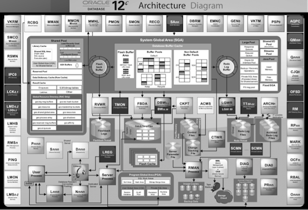 Oracle 12c运行架构也是共享内存和多进程方式,采用共享内存进行大批量处理,共享内存下面进程又有子进程,相对比较复杂。