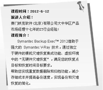 Symantec Backup Exec™ 2012 让您比以往更轻松地设置备份、管理备份策略、执行灾难恢复、将服务器备份转换为虚拟机,实现即时灾难恢复。无论应用环境多么复杂或是异构系统,管理和监控保持始终如一的易用与透明度。