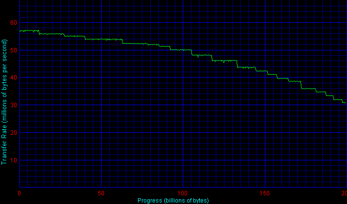 实测得到WD1200BB/JB硬盘的外延数据传输率都是为56.5MB/s,真是出奇地一致。而它们的内延数据传输率约为33MB/s,此两项测试结果都表现不错,超过了同期推出的希捷酷鱼V代不少。