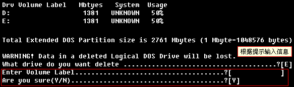 如果没有Non-DOS分区,那么在删除分区中需要最先删除逻辑盘,如图35所示。选择了盘符后,系统会给出确认提示。回答“Y”后,系统即可将E盘删除,重复同样的步骤,可以将全部逻辑盘删除。
