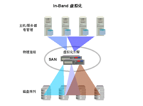 In-Band虚拟化引擎位于主机和存储系统的数据通道中间,控制信息和用户数据都会通过它 ,而它会将逻辑卷分配给主机,就象一个标准的存储子系统一样。