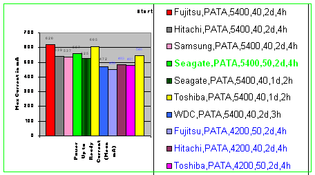 数据所示为各种硬盘从加电到进入就绪状态期间的平均电流。此次所测量的硬盘平均电流消耗从472mA到620 mA不等。希捷的Mercury硬盘此次测量的电流消耗为557mA。
