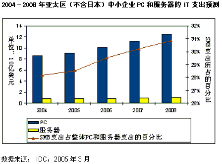 存储在线 6月28日北京消息:IDC预计2005年亚太区(不含日本)的中小企业在PC上的花费总额为91亿美元,在服务器上的花费稍多于8亿美元。而且,IDC预计中小企业对本地区PC和服务器整体支出的贡献率将从2004年的28%逐步增加到2008年的31%。