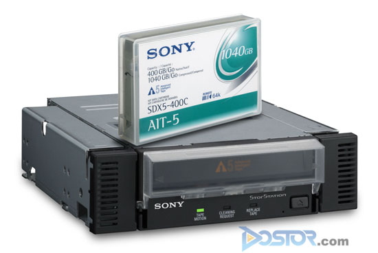 另外,Sony AIT-5新品采用了紧凑型的3.5英寸驱动器封装,是目前市面上体积最小的可支持400GB的本机容量和24 MBps的持续性本地传输速率的磁带机产品。比如,AIT-5 格式的先进智能磁带机驱动器型号SDX-1100V,采用媒介型号SDX5-400C。 磁带尺寸仅101.6 mm x 41.2 mm x 155 mm,但单个磁带容量达到惊人的400 Gbyte 和1040 Gbyte(2.6:1 数据压缩) ,持续传输速率可达到24 Mbyte/s和62 Mbyte/s (2.6:1 数据压缩),在 100% 负荷周期时,平均无故障时间400,000 POH,磁头寿命50,000 小时,平均文件存取速度小于44秒。典型的小身材,大容量。