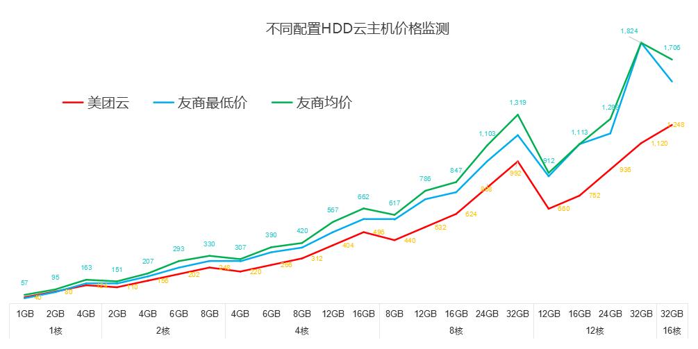 根据不同配置HDD云主机价格监测图,美团云价格是同配置友商均价的6折-85折,是友商中最低价的6折-9折,而且配置越高,美团云价格优势越明显。