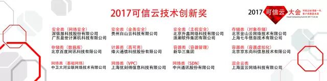 可信云技术创新奖是为了表彰已在计算、存储、网络、安全、容器以及混合云等技术上解决了目前的痛点问题,有突出创新的企业。可信云技术创新奖包括:安全类(网络安全)、安全类(业务安全)、安全类(主机安全)、存储类(对象存储)、存储类(数据库)、计算类(高可用)、容器类(容器管理)、容器类(容器虚拟化)、网络类(基础网络)、网络类(VPC)、网络类(SDN)、混合云类。2017可信云技术创新奖的获奖企业有: