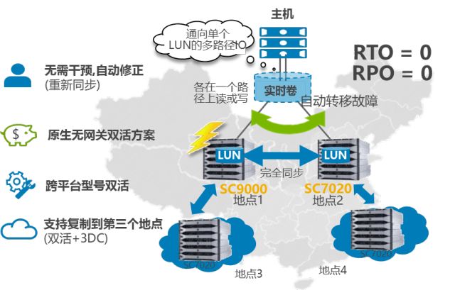 Dell EMC SC系列存储阵列更是内置了Live Volume灾难恢复/业务连续性解决方案,用户无需安装额外的第三方软硬件,即可构建双活系统,还能进一步拓展为远程灾备或者两地三中心灾备方案。