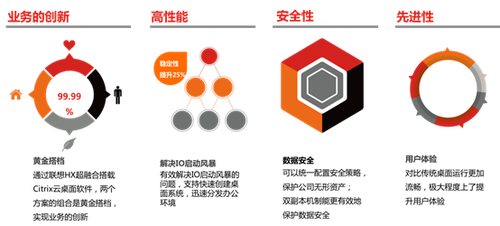 通过联想HX超融合+Citrix这对桌面虚拟化的“黄金搭档”,海峡银行实现了对桌面环境的统一管理,显著降低了管理难度和维护成本;可以统一配置安全策略,杜绝了传统桌面环境数据泄露的风险,保护公司无形资产。