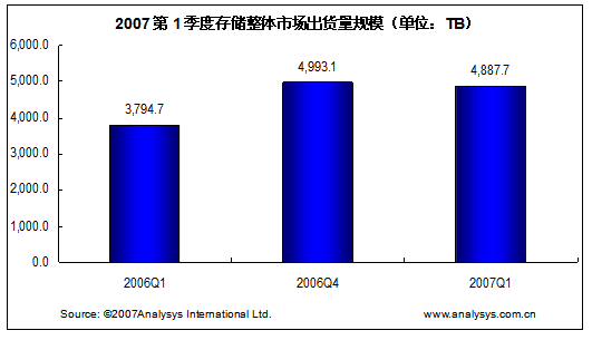 2007年第1季度存储系统整体市场存储出货量为4887.7TB,相比上季度下降了2.1%,市场价值为12.4亿元,相比上季度下降了6.1%,本季度大行业采购减少导致了市场存储出货量和销售额的减少。与去年同期相比,存储出货量增长了28.8%,市场价值增长了22.8%,存储市场逐步进入高速发展期,今后三个季度都将保持20%的同比增长率。