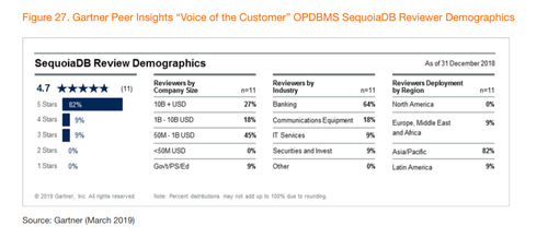 在Gartner Peer Insights的评价数据当中,有82%的用户为巨杉数据库评了五星满分,其中有27%的用户评价来自于百亿美元规模的公司,同时有64%的用户评价来自于金融银行业。
