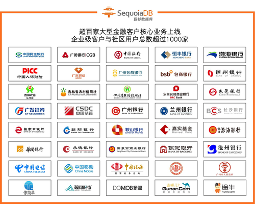 目前,SequoiaDB 巨杉数据库的付费企业级客户与社区用户总数超过1000家,并已在近百家500强级别的银行、保险、证券等大型金融机构核心生产业务上线。其业务场景包括分布式核心在线交易、分布式内容管理以及数据中台、数据湖、云数据库平台等。这些场景均在大型商业银行业务实际落地,许多场景的应用类型和技术要求甚至大大高于海外同类金融企业。