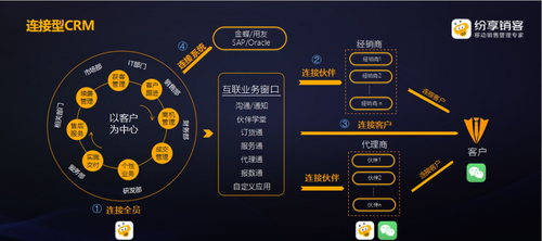 纷享销客连接型CRM其核心就是互联与赋能,构建客户为中心的企业数字化经营体系,帮助企业实现从内部到外部,从管理到业务的升级和赋能,完成整个业务生态体系的互联互通。