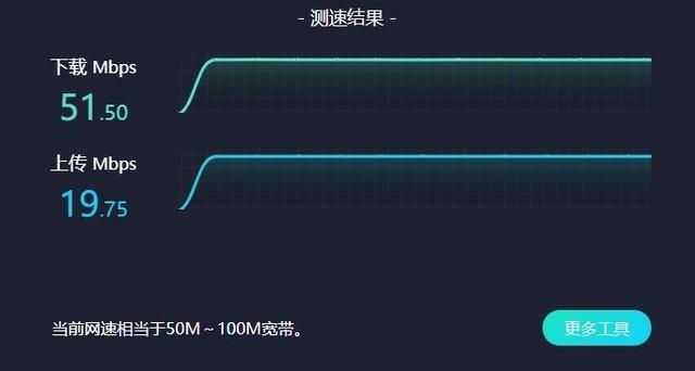 安装完毕后,我在网页端对网速进行了测试,我家中使用的是电信100M光纤,最终测速结果为下行51.50Mbps,上行19.75Mbps。对于百兆光纤来说,考虑到数据在传输中的损失,这一测试结果还算不错。