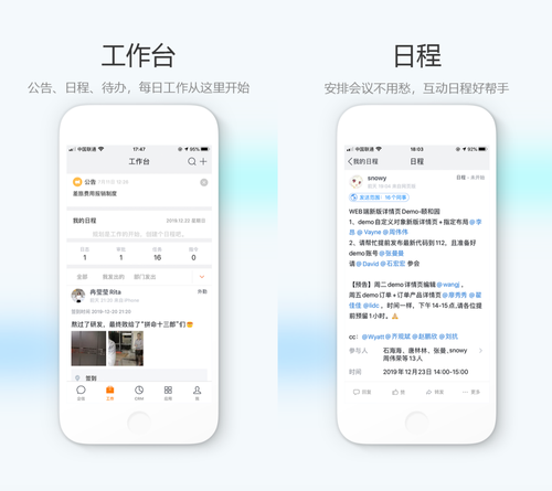 1.工作台:公告、日程、待办,每日工作从这里开始