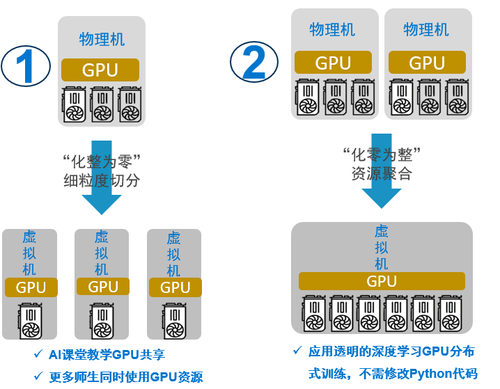 按照传统模式,为每个学生分配一张物理GPU卡,成本是非常高昂的。此时,GPU动态加速云解决方案,实现GPU计算资源池化,对GPU算力(CUDA核心)和显存精细化切分,支持多个学生同时使用单张物理GPU资源并且互不干扰,AI教育环境下可以提升GPU利用率4-10倍。