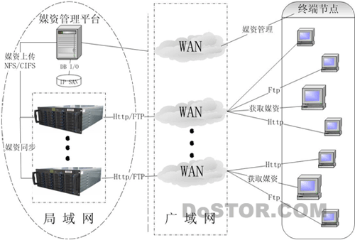 普通的数据分发应用可以通过一个服务器完成. 但是对于上例中的应用, 一个服务器是远远不能满足要求的. 目前, 为了解决上面音视频分发业务数据存储要求, 一般是在平台和终端设备之间的数据传输采用支持断点续传功能的HTTP协议和FTP协议. 在平台中采用多台支持HTTP协议或者FTP协议的媒资服务器. 前端通过一个负载均衡服务器将终端请求接入再分发给后面的媒资服务器. 终端节点通过广域网访问媒资管理平台,获取媒资列表。每个终端节点通过广域网联接均衡负载服务器,均衡负载服务器根据当前各媒资存储服务器的负载状态将终端节点的连接请求分发到相应媒资服务器上。考虑到存储的高可靠性, 在该方案中,一般采用媒资服务器后连接传统的存储设备, 例如, SCSI RAID阵列或者FC RAID阵列.