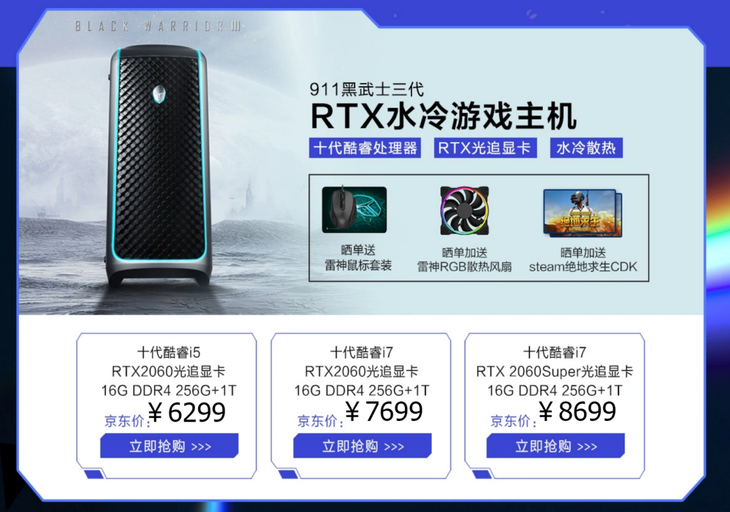 活动期间购雷神911黑武士三代水冷台式机-RTX光追型号,售价仅6299元起,晒单送雷神鼠标/RGB散热风扇/绝地求生CDK,可以点击下方链接,还有更多惊喜优惠等你领取!