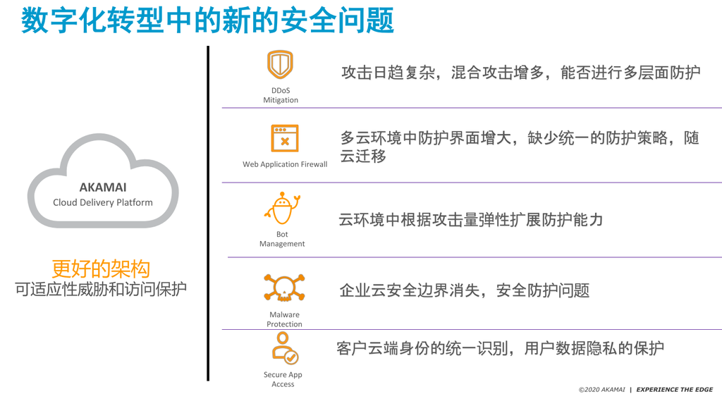 2020年9月已经入所谓的“后疫情时代”,在此背景下,Akamai分享了疫情下令人触目惊心的网络安全新形势,并介绍了边缘安全在帮助企业应对安全威胁时的优势,而Akamai凭借在CDN网络节点以及安全方面的积累,做起边缘安全方案时有较强优势。