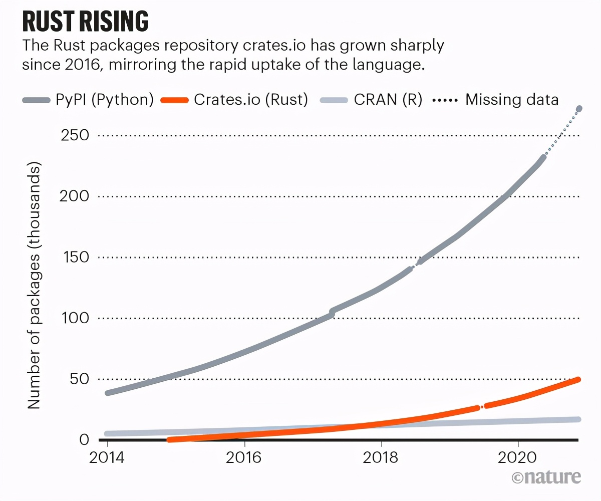 Rust 的第三方软件包生态系统可以辅助软件开发,目前第三方库数量已经接近 50,000(参见下图“Rust rising”)。它们封装了诸如生物信息学(Koster ‘s Rust-Bio)、地球科学(the Geo-Rust project)和数学(nalgebra)等学科的算法。尽管如此,Nichols 说,“如果你需要的库在 Rust 中没有,那肯定就会让人感觉不爽。”不过,程序员有时可以使用 Rust 的“外部函数接口”来弥补这一差距。