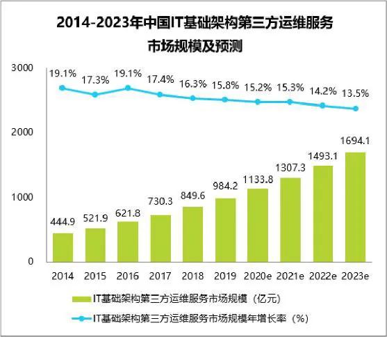 据艾瑞咨询联合北京软件和信息服务业协会发布的《中国IT基础构架运维市场研究报告2020》显示,2019 年中国 IT 服务市场规模达到 7681.3 亿元,同比增长 11.9%,2014-2019 年的年复合增长率为 13.3%。