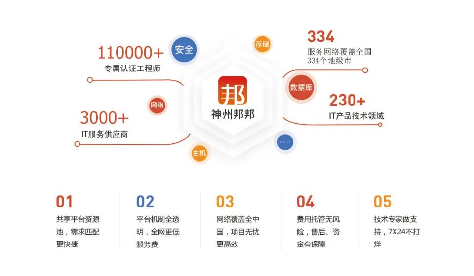 神州邦邦业务团队是IT服务与互联网人的互补融合,在IT服务行业有着超过十多年市场销售以及交付的经验,正在全力推进平台智能化的发展应用,加速实现全国的IT服务品种类和区域的覆盖,并且根据现有服务展开邦培训,邦认证,邦招聘,邦备件等系列衍生服务,更推动完善整个服务交付的质量以及为平台工程师进一步提升技能,增加收入。 目前,邦邦已与神州数码、新华三、海量数据、京东商城、DELL、思科、云智慧、第四范式、旷视等公司建立深度合作关系。