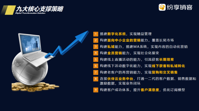 在具体的转型过程中,刘晨还提出,围绕上述细分目标,从构建数字化系统、私域能力、全员营销能力,到实现线下获客和私域转化、复购和交叉销售,再到连接伙伴云业务中台实现业务闭环、构建客户成功体系提升客户满意度,九大核心支撑策略需引起转型企业的重视。
