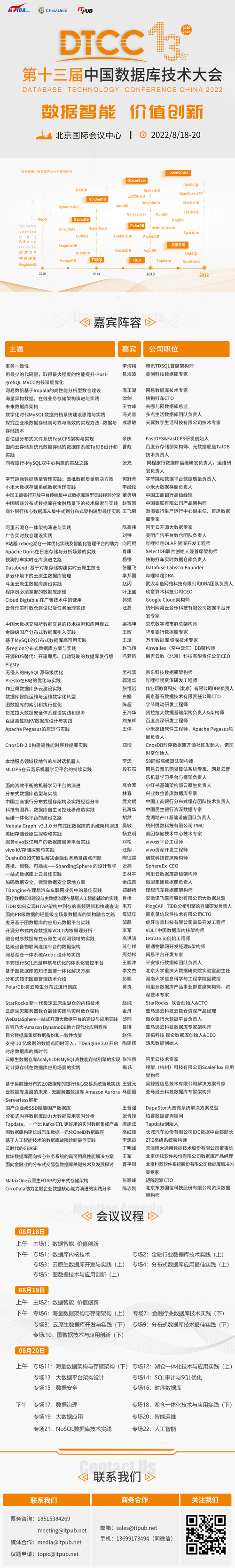 2022年8月18日~20日,由IT168联合旗下ITPUB、ChinaUnix两大技术社区主办的第十三届中国数据库技术大会(DTCC2022)将在北京国际会议中心隆重召开。大会以“数据智能 价值创新”为主题,紧跟时代步伐,引领前沿技术,设置2大主会场,20+技术专场,将邀请超百位行业专家,重点围绕时序数据库、图数据技术、实时数仓技术与应用实践、云原生数据库、大数据平台与数据安全等内容展开分享和探讨,为广大数据领域从业人士提供一场年度的饕餮盛宴。作为顶级的数据领域技术盛会,DTCC2022将继续秉承一贯的干货分享和最佳实践砥砺前行。