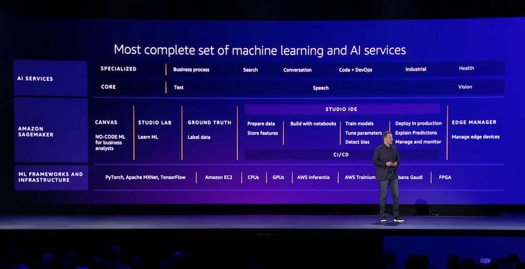 在AI和机器学习部分,亚马逊云科技从IaaS到PaaS和SaaS全覆盖。IaaS层支持的硬件类型特别多,除了英伟达的显卡和英特尔的Habana Gaudi,还有FPGA和自研的训练芯片Inferentia,PaaS层最值得关注的还是机器学习IDE——Amazon SageMaker。