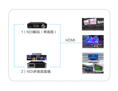 通过矩阵分发后的NDI信号,可通过千视NDI解码器(将NDI解码成HDMI信号)进行单画面输出上屏,也可部署NDI多画面系统实现任意多画面上屏。对于需要自主播放视频源的屏幕,如VIP室或休息室的屏幕,千视NDI解码器可预设9个播放地址,通过USB扩展无线小键盘,实现多路信号的平滑切换输出。