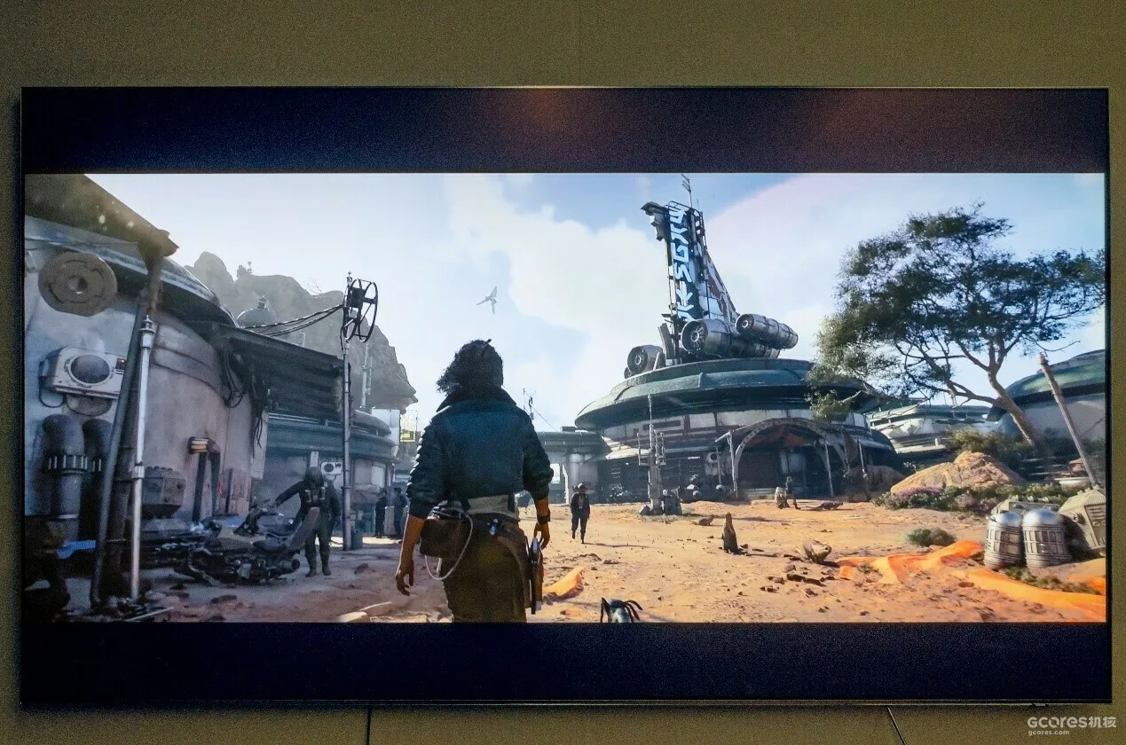 进入正文,首先我们来说一下大家最关注的游戏实际体验,在S95D中《星球大战:法外狂徒》游戏呈现出光影精细和明暗对比丰富的画面,能清晰地感受到S95D的OLED自发光屏和AI自适应优化的优势,通过高对比度的画面和AI调试很好的体现了浩瀚银河系中的各种场景。