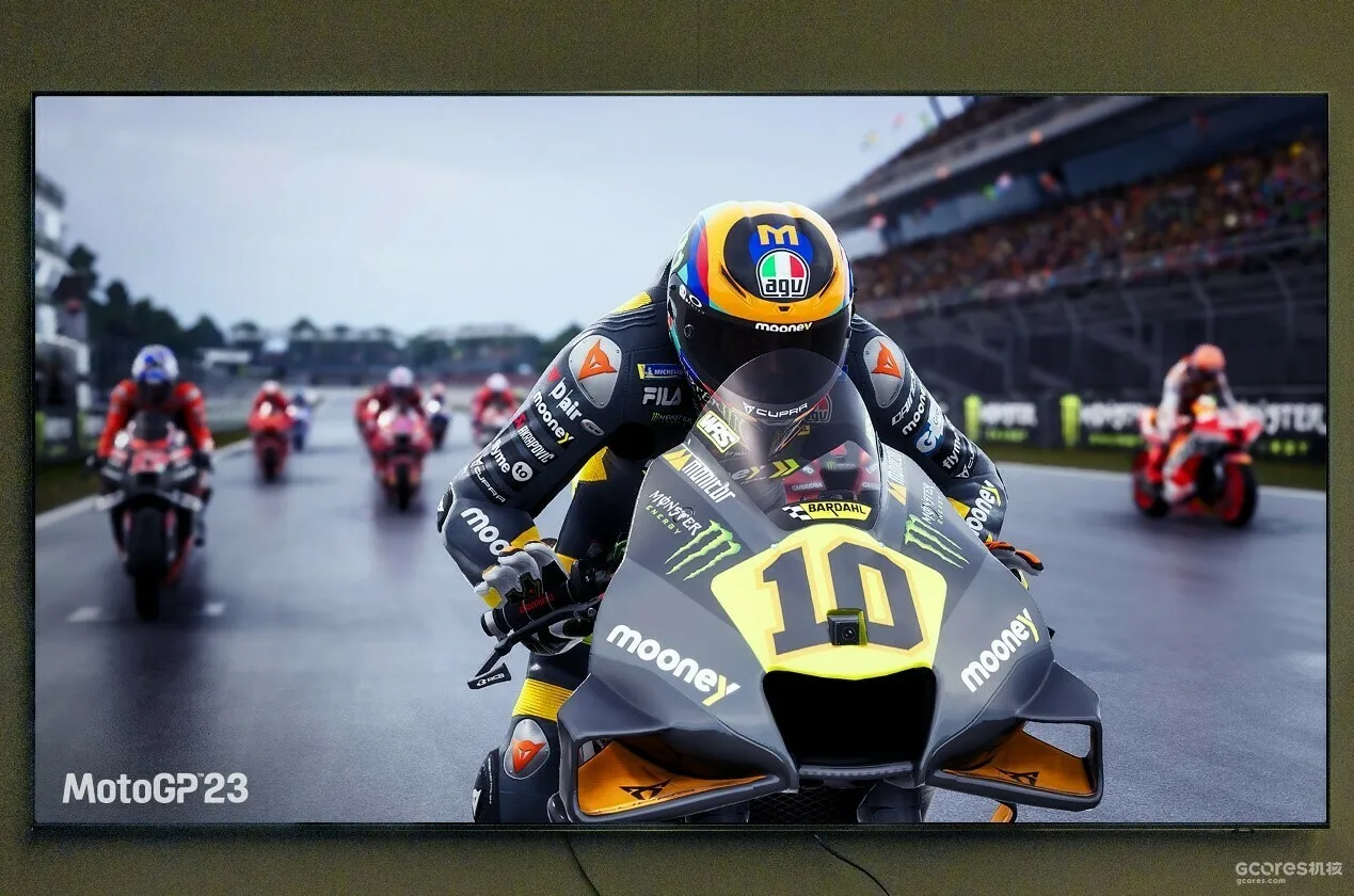而在色准方面,我们也尝试了知名拟真游戏MotoGP 23,来检测S95D的色彩呈现效果。可以清楚感受到S95D的画面还原度,尤其是车身和头盔的颜色在光影之下呈现出自然的过度,十分逼真。在PANTONE色彩认证加持下,S95D可以呈现出更接近自然的色彩。另外,S95D 的智能护眼模式则能根据环境光传感器自动调整亮度和色温,在环境光暗淡的时候适当降低亮度,保护眼睛降低疲劳感。更自然的色彩、舒适的亮度与色温,也带来更舒适的游玩环境。