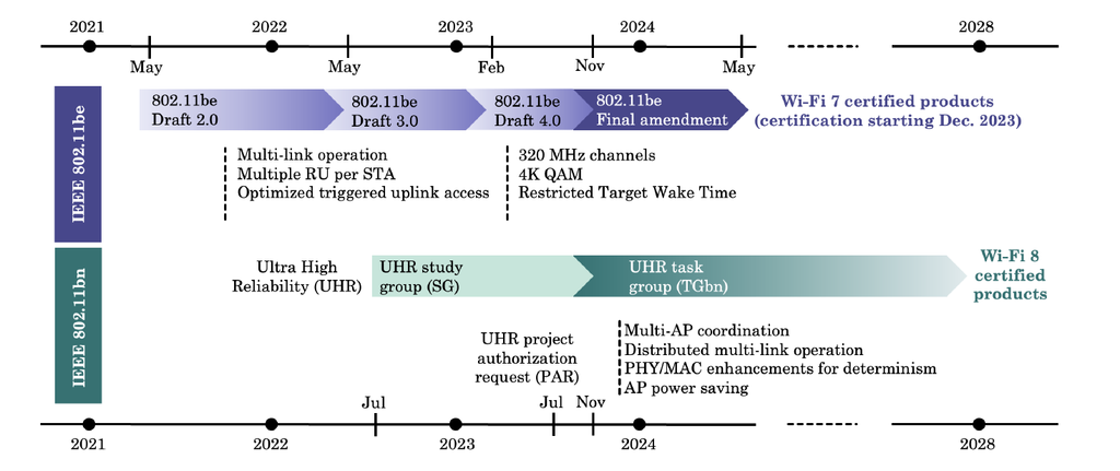 图2. IEEE 802.11be (Wi-Fi 7) 与802.11bn (Wi-Fi 8) 标准化工作的时间表(图片来源:arxiv.org)