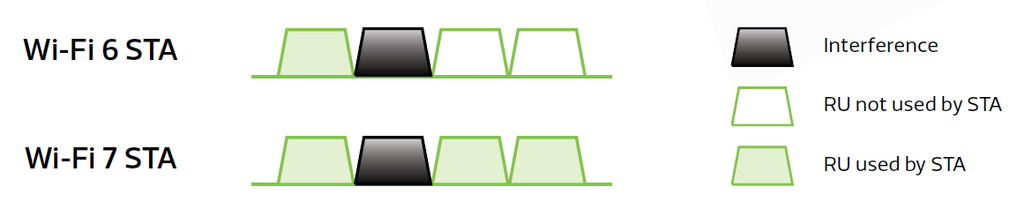 MRU 的另一个优势在于,它能够降低干扰对可用频道的影响,并进一步提升OFDMA的效率。前导码打孔(Preamble Puncturing)技术在Wi-Fi 6中已被引入,而在Wi-Fi 7 中,该技术结合MRU的特性,使其工作机制变得更加灵活。在Wi-Fi 6的架构下,执行前导码打孔后,其RU仍需通过OFDMA机制分配给“多个”用户,这意味着在单一用户的使用场景下,前导码打孔无法发挥其优势。然而通过MRU,执行前导码打孔后的RU可以全部分配给一个用户,并且即使在不连续的频谱 (non-continuous spectrum) 环境下,也能够执行前导码打孔操作。