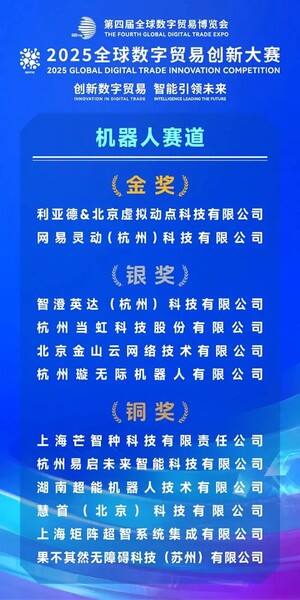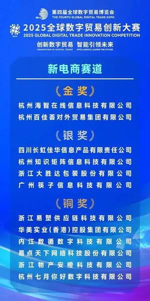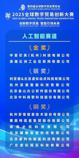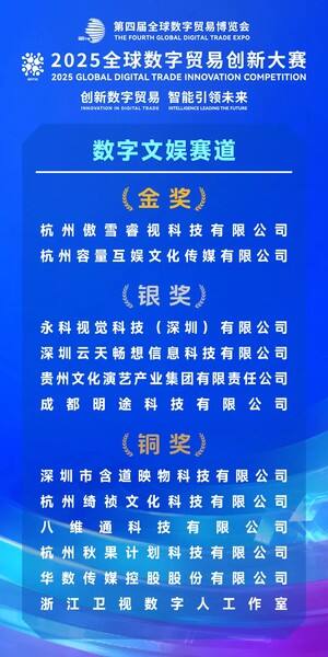 9月28日,2025全球数字贸易创新大赛(以下简称“数贸大赛”)数字文娱赛道决赛结果出炉。杭州傲雪睿视科技有限公司、杭州容量互娱文化传媒有限公司斩获金奖,永科视觉科技(深圳)有限公司、深圳云天畅想信息科技有限公司、贵州文化演艺产业集团有限责任公司、成都明途科技有限公司摘得银奖,深圳市含道映物科技有限公司、杭州绮祯文化科技有限公司、八维通科技有限公司、杭州秋果计划科技有限公司、华数传媒控股股份有限公司、浙江卫视数字人工作室(浙江新蓝网络传媒有限公司)获得铜奖。