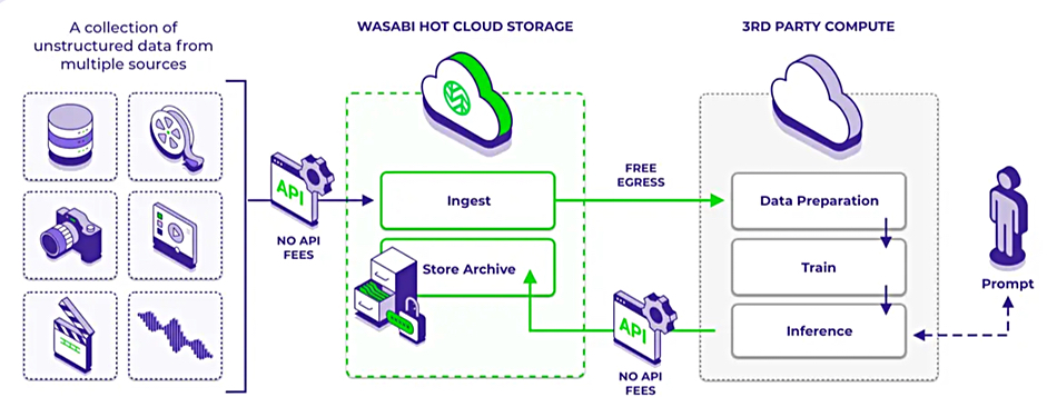 AiR技术不仅可以对采集的数据进行自动索引、编目和添加自定义元数据,还可以与各类 GPU提供商(如Nvidia Inception Program)、AI/ML工具(如大型语言模型)、ML平台和云 AI 服务无缝连接。Wasabi的AI存储设施以其低延迟对象存储为特点,通过100 Gbps 的直连速度显著提升了训练、微调和推理的速度,实现实时AI更新。
