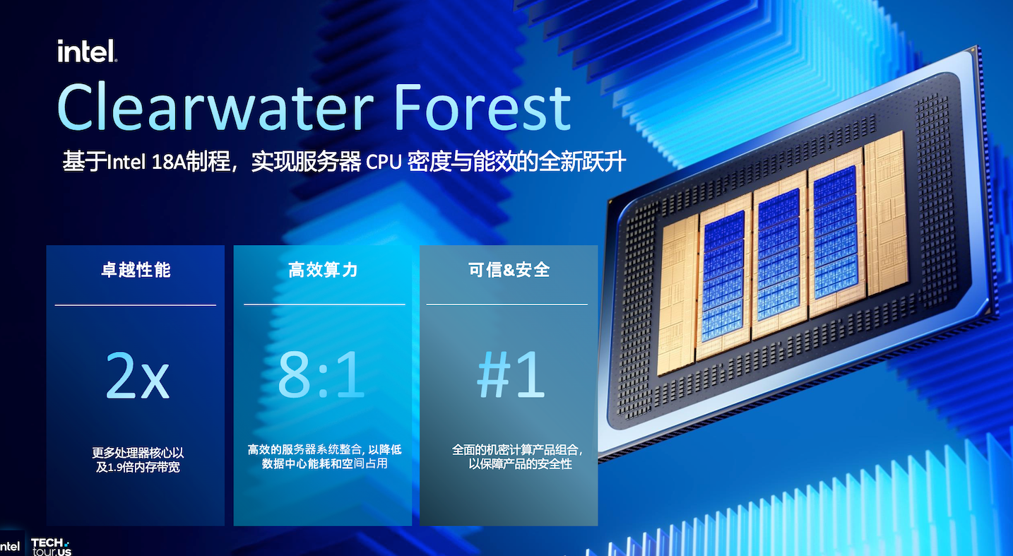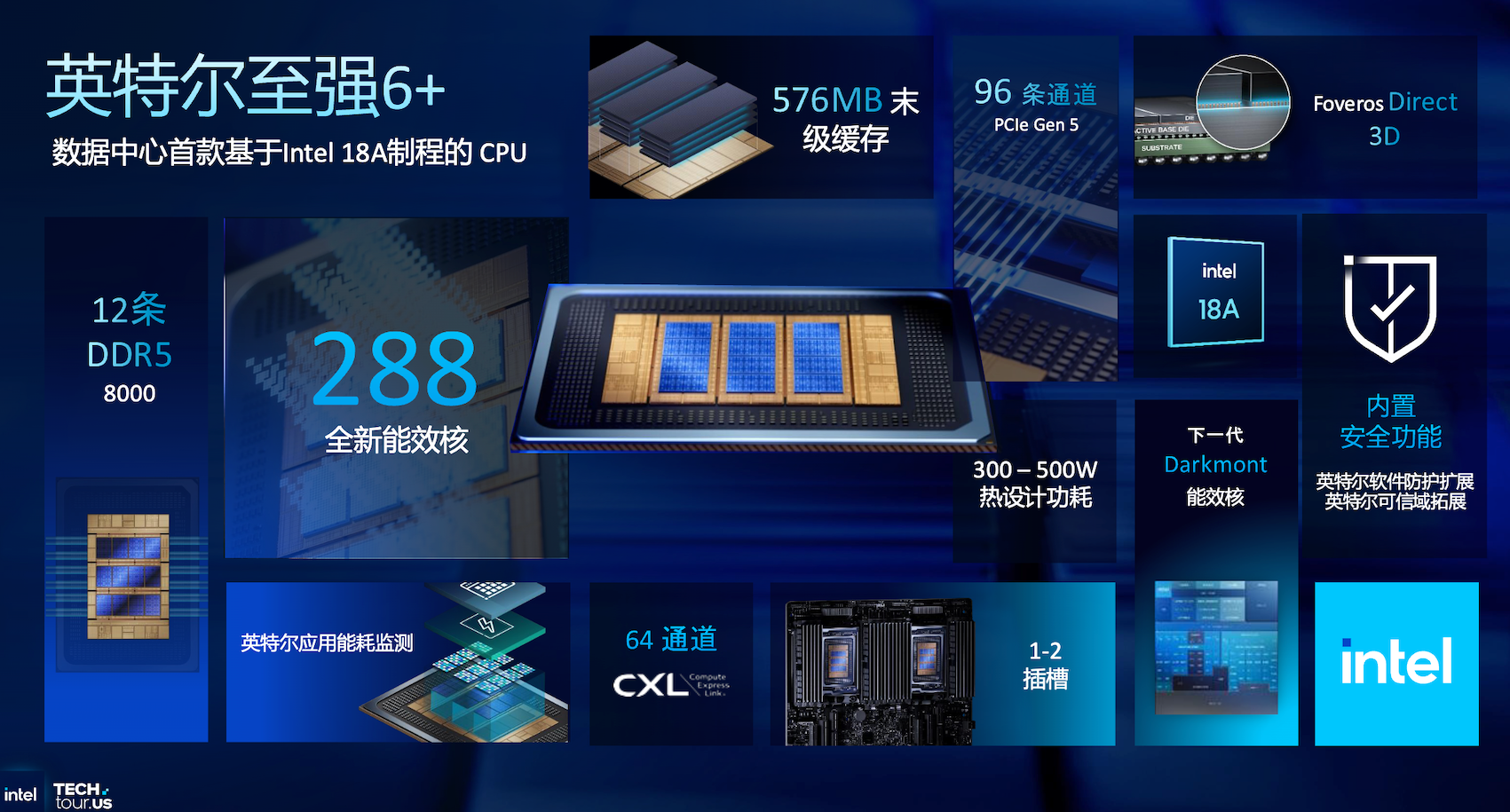 2025年10月,英特尔向外界公布了基于Intel 18A工艺的全新至强6+处理器,其代号为Clearwater Forest,是Sierra Forest的后续产品。它同样属于能效核处理器,但核心数从最高144个提升到了288个。
