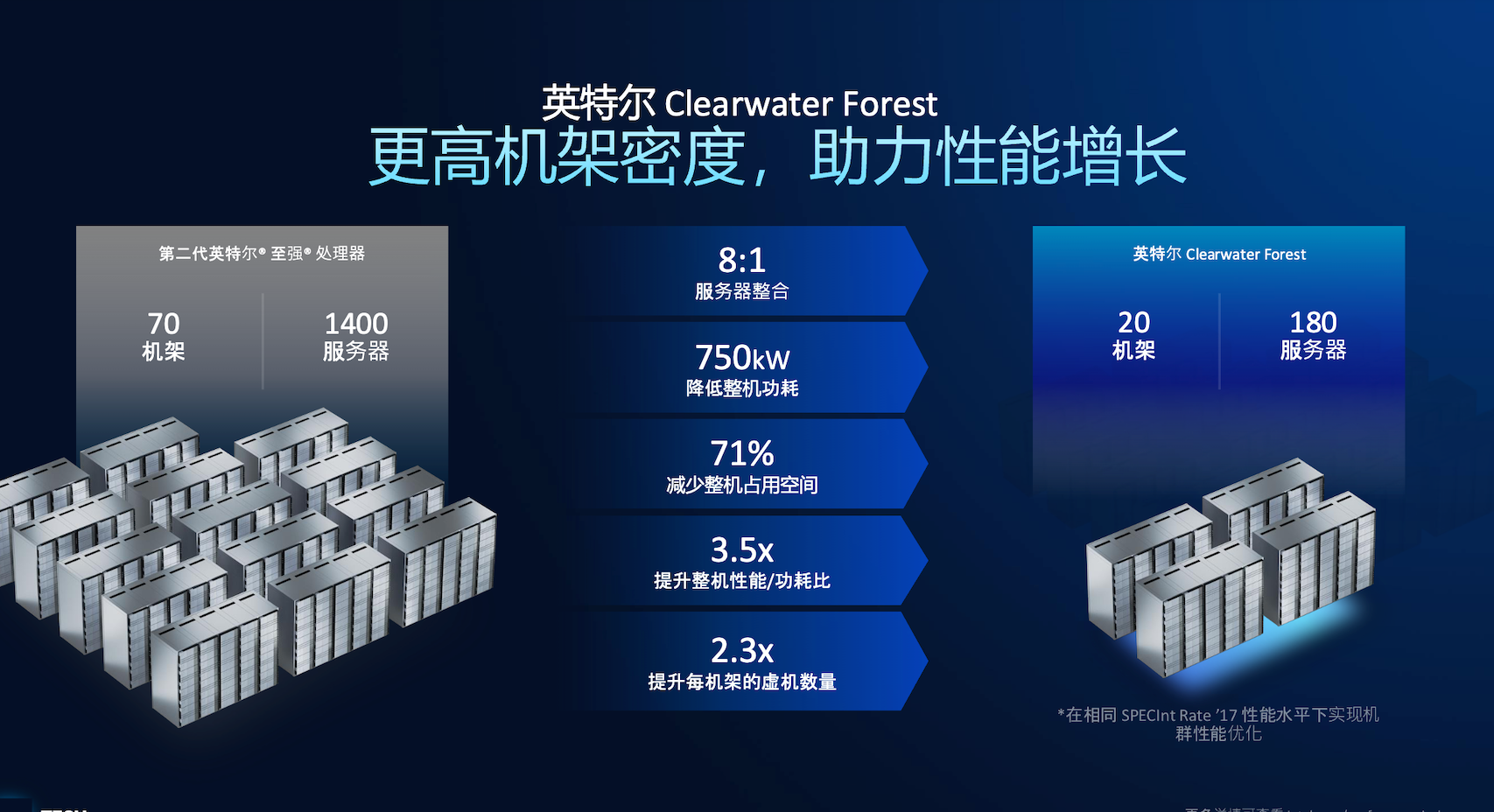 核心数的增长意味着可以用较少的服务器,提供相同的算力。现在使用20台机架180台Clearwater Forest服务器就可以替代70个机架1400台第二代英特尔至强服务器,两者提供相同的算力,完成了8:1的服务器整合比例,降低71%的数据中心占用空间。