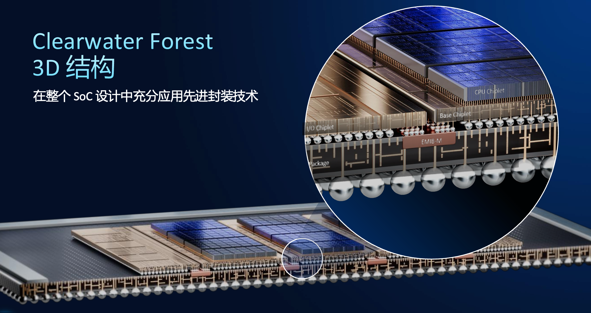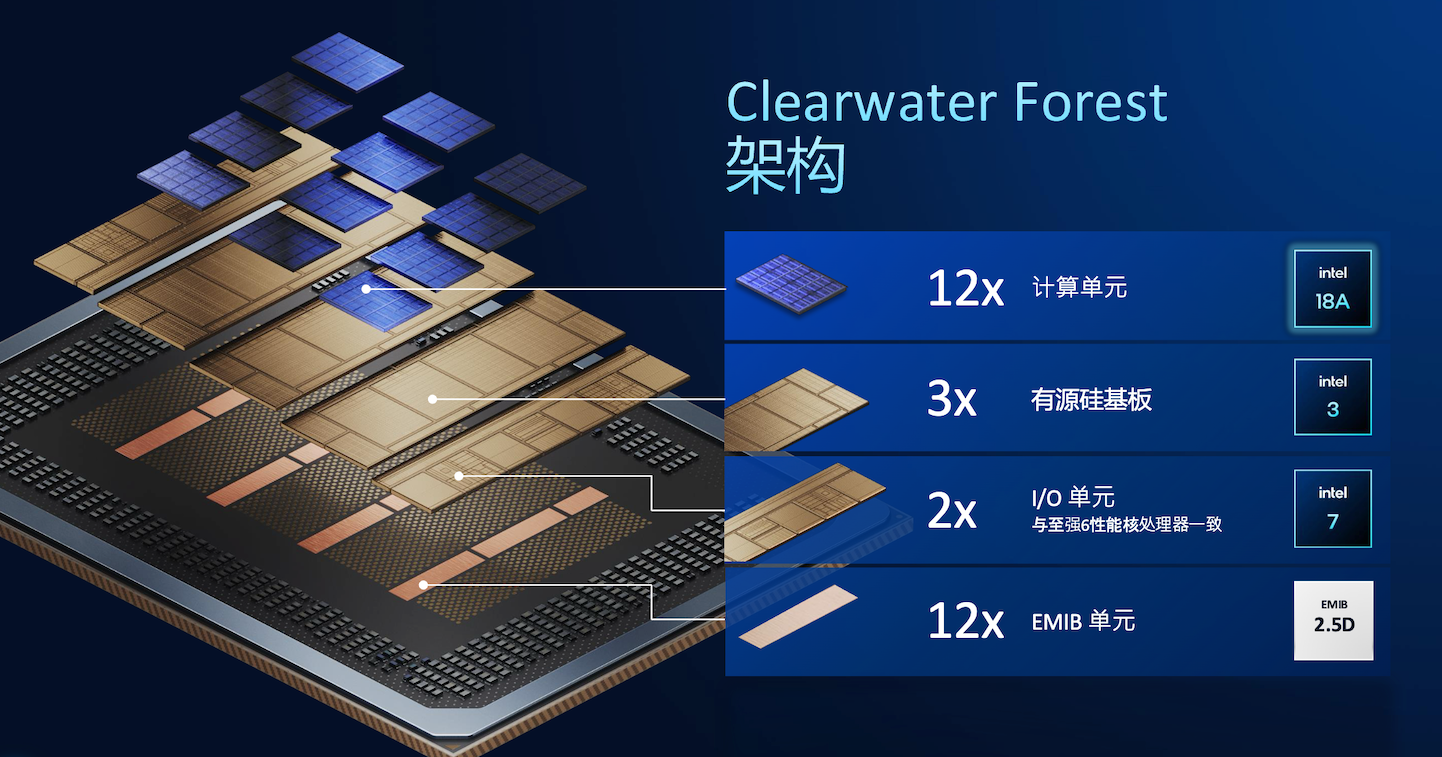 Clearwater Forest采用了Foveros Direct 3D技术,将计算单元与下方的有源硅基板(Base Chiplet) 通过铜对铜混合键合垂直连接,有源硅基板再通过EMIB 2.5D与 I/O芯片互联,形成一种类似3.5D的封装架构。